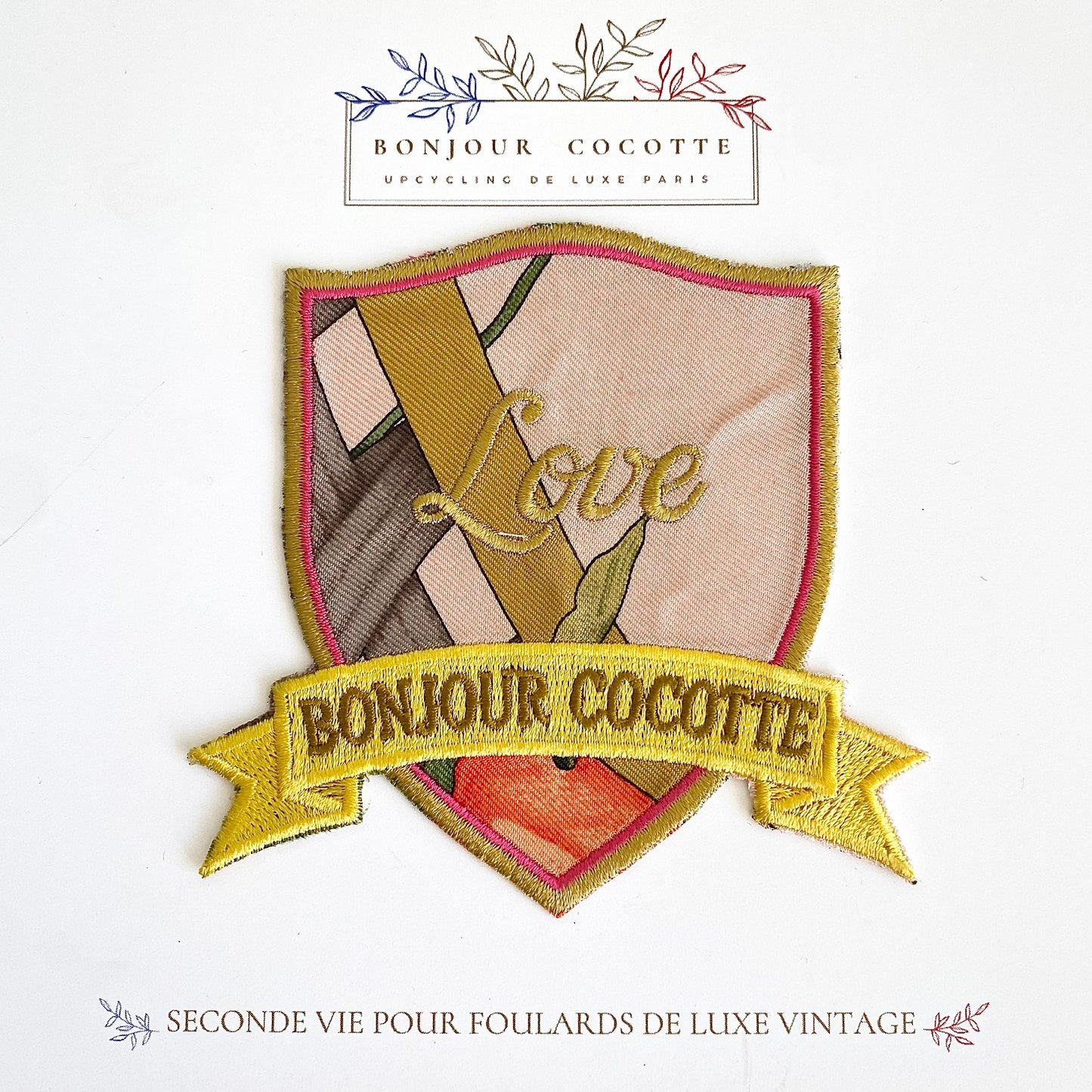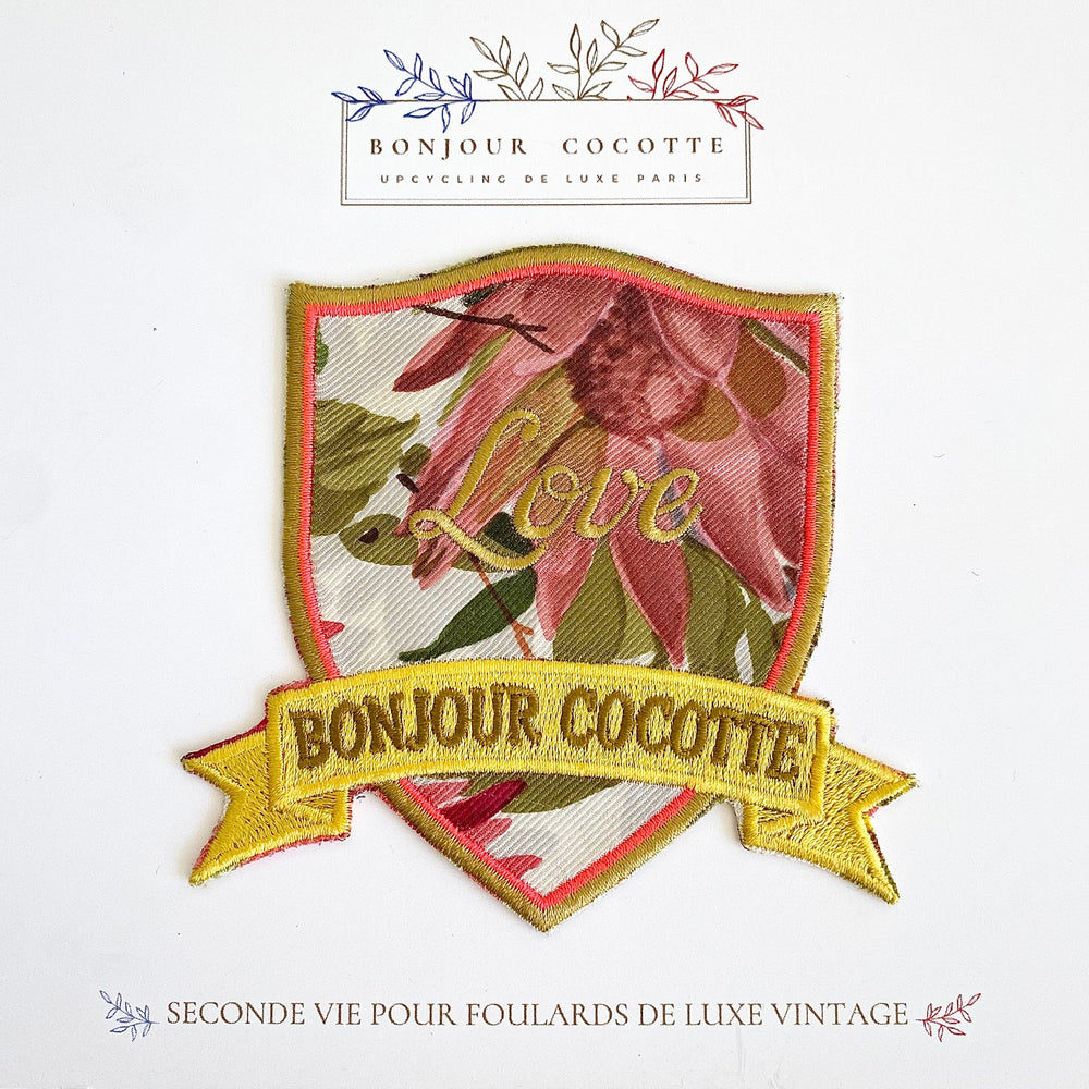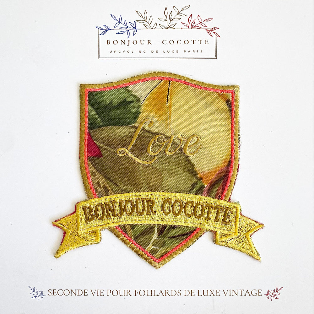Ajoutez une touche personnalisée à votre garde-robe avec nos écussons et patchs brodés thermocollants en soie, fabriqués à partir de foulards de luxe vintage revalorisés.